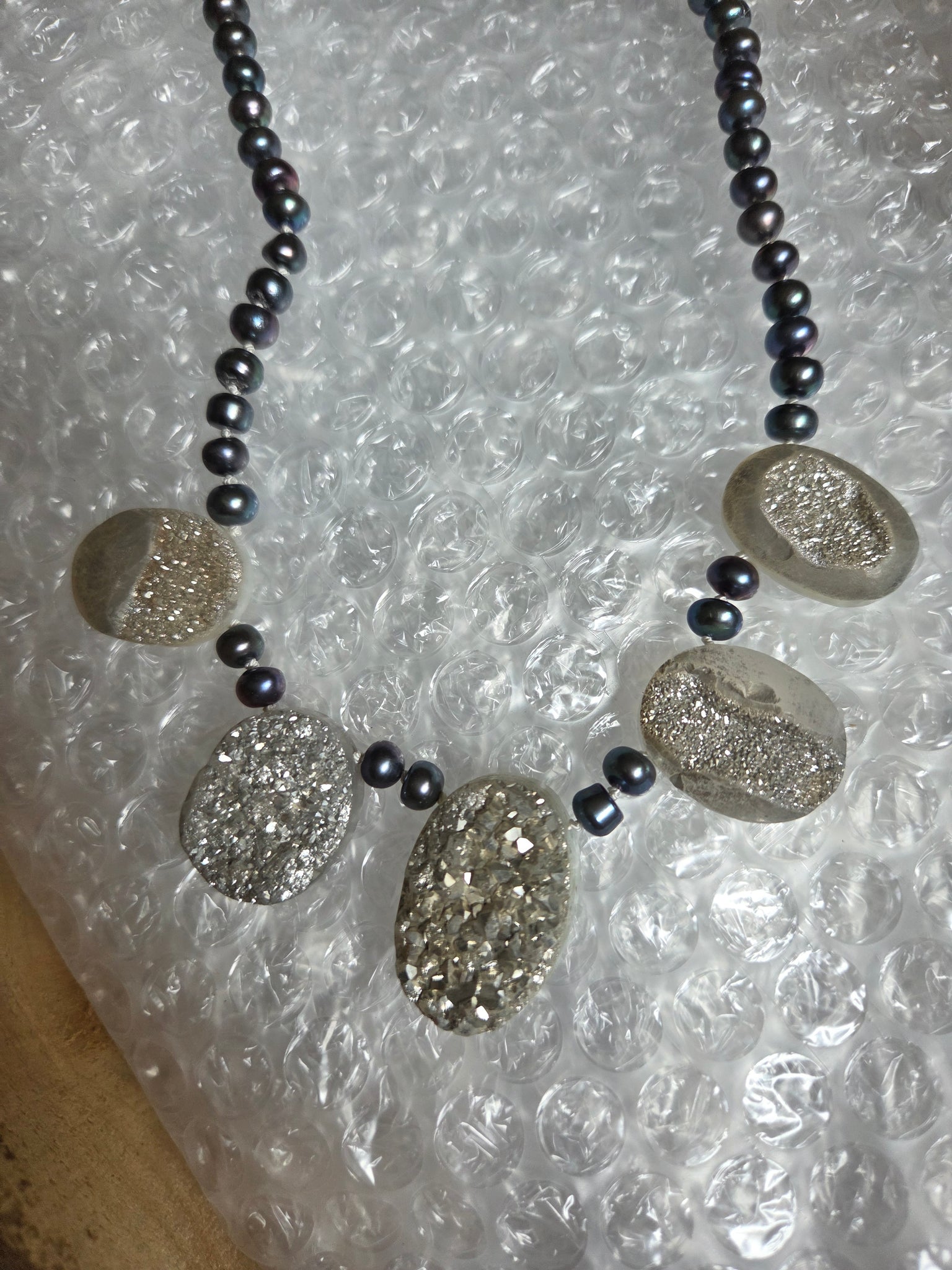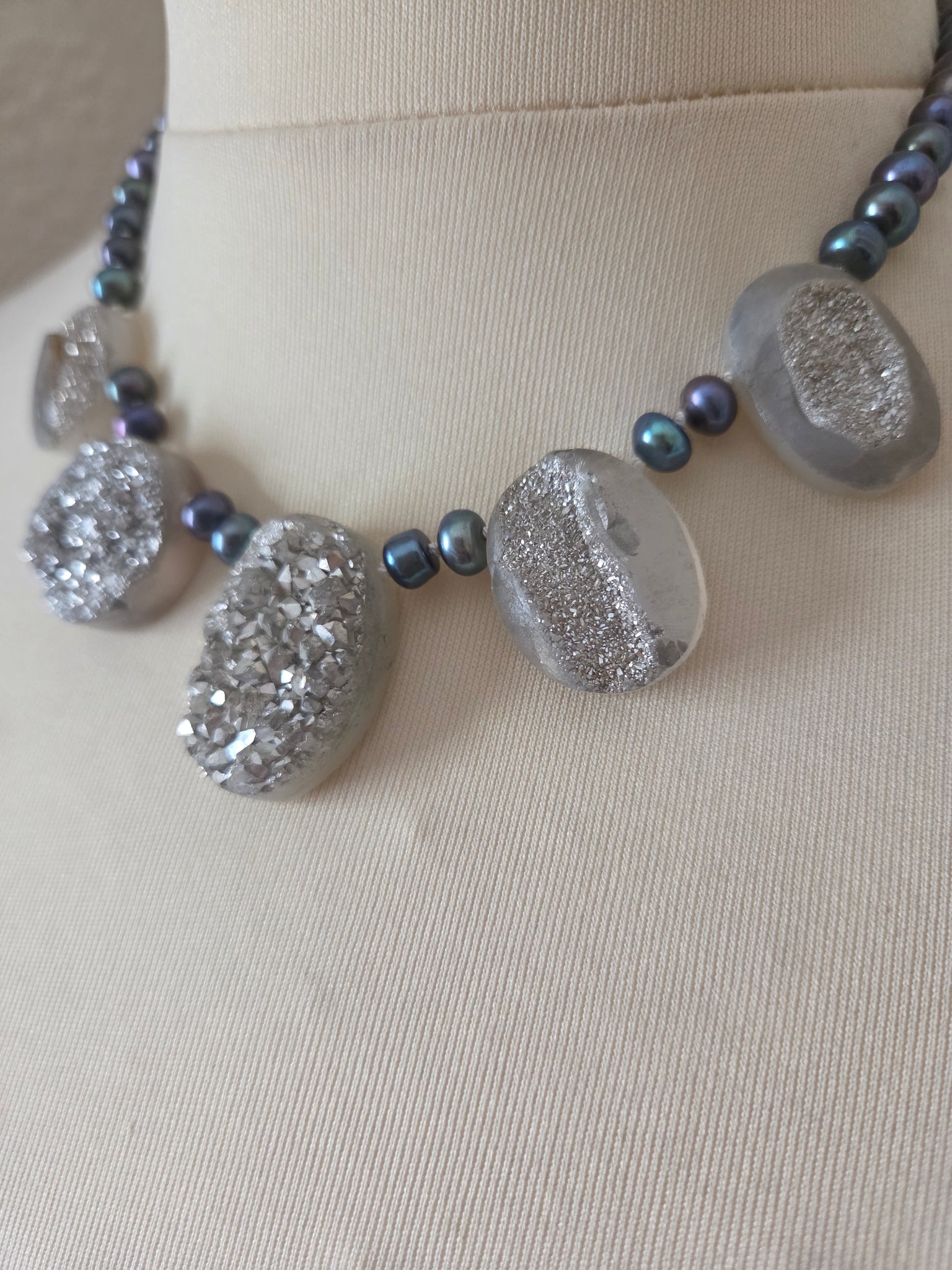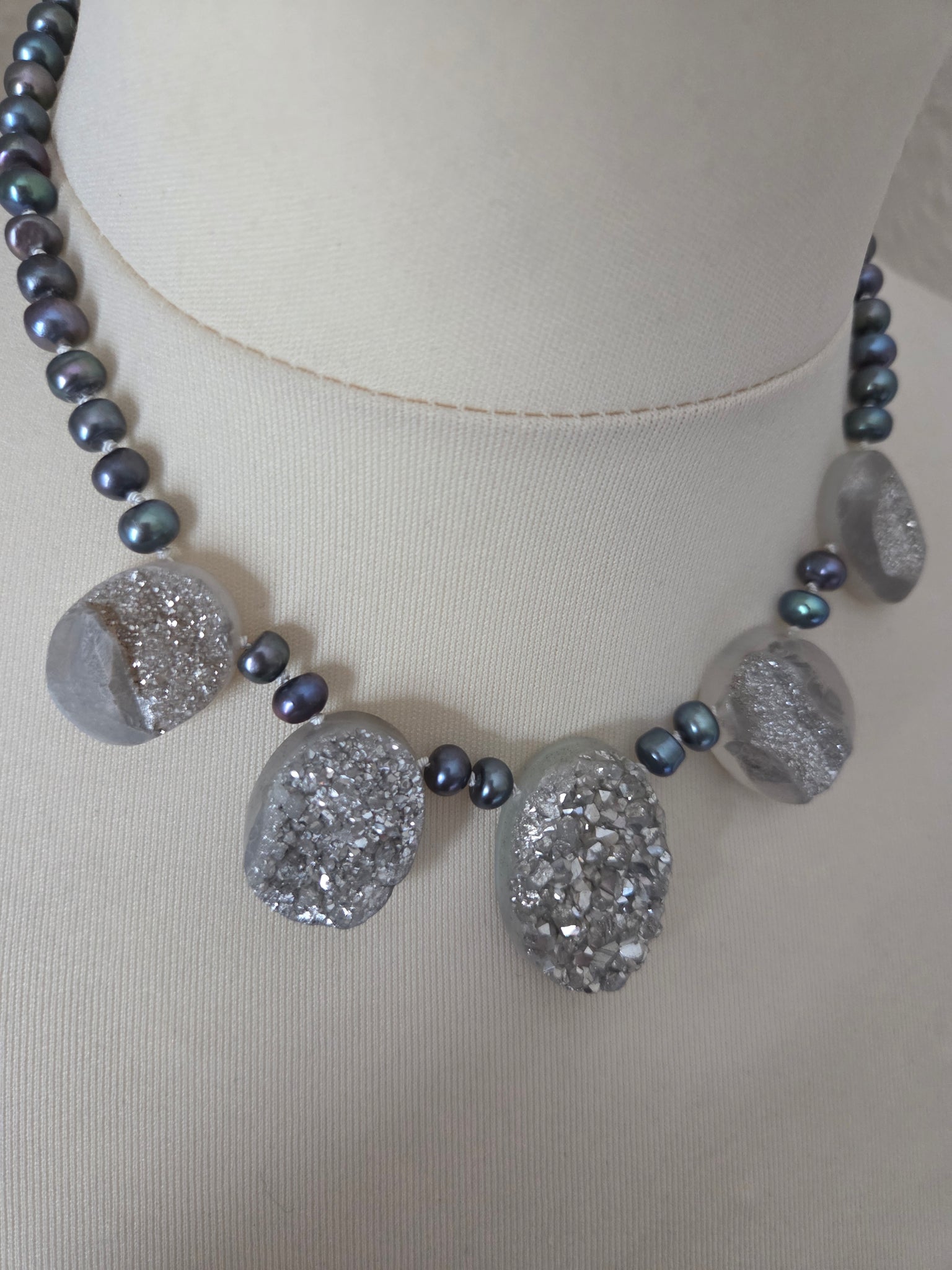 Stunning druzy quartz ovals teamed with peacock freshwater pearls.